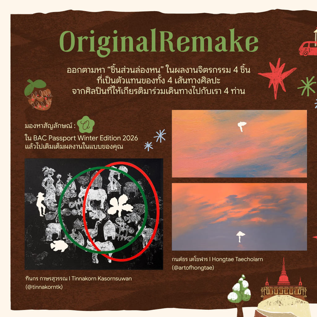 สำหรับฉบับฤดูหนาว ขอเชิญร่วมเดินทางสู่ Winter Tale พาสปอร์ตเล่มใหม่นี้ เรามีผลงานจิตรกรรมจากศิลปินมาร่วมเดินทางไปกับเราด้วยถึง 4 ท่าน ในกิจกรรม OriginalRemake ที่ชวนผู้ถือพาสปอร์ตทุกท่านเดินทางค้นหาชิ้นส่วนล่องหนในผลงานทั้ง 4 ชิ้น เราหวังว่าทุกคนจะได้อบอุ่นใจกับห้วงเวลาที่น่าจดจำ การพบพาน และเรื่องราวน่าประทับใจในหลากหลายมุมของเมือง เราขอชวนมองมุมเดิมด้วยสายตาใหม่ และค้นพบสถานที่ที่ยังไม่เคยไป และระหว่างการเดินทางเราจะพบกับตราประทับออกแบบพิเศษเพื่อผุ้ถือพาสปอร์ตเล่มนี้ ซึ่งจะเป็นเสมือนกุญแจพาทุกคนไปชมงานศิลปะและเก็บเกี่ยวประสบการณ์ที่จะเปลี่ยนหนังสือเดินทางเล่มใหม่นี้ให้เป็นสมุดบันทึกเรื่องราวส่วนตัว และความทรงจำจากกรุงเทพ เมืองศิลปะ